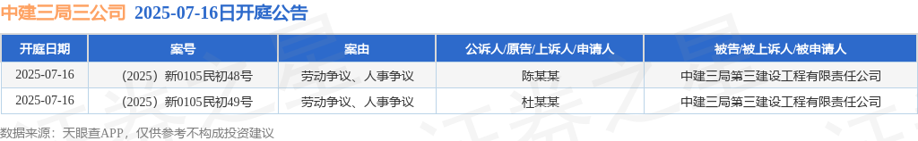 中建三局三公司作为被告/被上诉人的2起涉及劳动争议、人事争议的诉讼将于2025年7月16日开庭来源:网络 热度:8℃ 2025/7/14 0:14:15 证券之星消息,根据天眼查APP显示,近日公布了2则中建三局第三建设工程有限责任公司作为被告/被上诉人的开庭公告,案由为劳动争议、人事争议,开庭日期为2025年7月16日。详细内容如下: