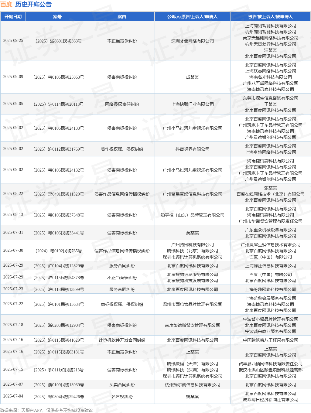 百度作为被告/被上诉人的1起涉及不正当竞争纠纷的诉讼将于2025年7月16日开庭来源:网络 热度:8℃ 2025/7/14 0:14:16 证券之星消息,根据天眼查APP显示,近日公布了一则北京百度网讯科技有限公司作为被告/被上诉人的开庭公告,详细内容如下: 案号:(2025)沪0115民初63181号