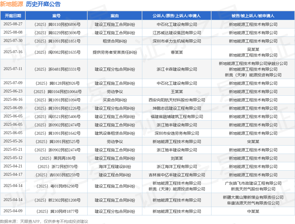 根据统计,近一年内以新地能源工程技术有限公司为当事人的历史开庭公告有38则,其中案由为“建设工程施工合同纠纷”的公告以14则居首,其次为“买卖合同纠纷”有6则,“建设工程分包合同纠纷”有3则。历史开庭公告(前20条)如下: