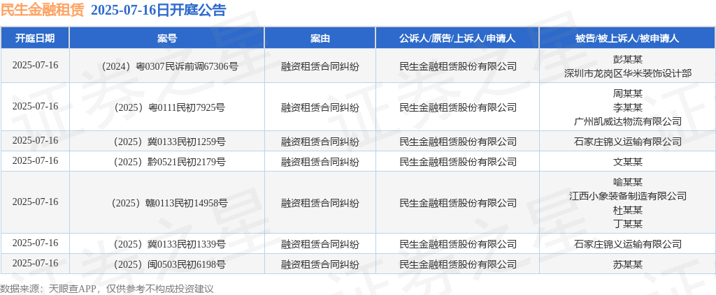 民生金融租赁作为原告/上诉人的7起涉及融资租赁合同纠纷的诉讼将于2025年7月16日开庭来源:网络 热度:7℃ 2025/7/14 0:14:20 证券之星消息,根据天眼查APP显示,近日公布了7则民生金融租赁股份有限公司作为原告/上诉人的开庭公告,案由为融资租赁合同纠纷,开庭日期为2025年7月16日。详细内容如下: