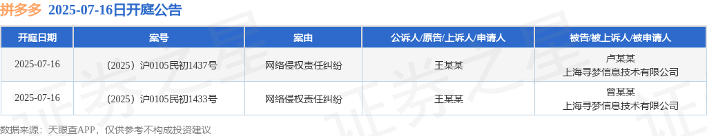 拼多多作为被告/被上诉人的2起涉及网络侵权责任纠纷的诉讼将于2025年7月16日开庭来源:网络 热度:7℃ 2025/7/14 0:14:21 证券之星消息,根据天眼查APP显示,近日公布了2则上海寻梦信息技术有限公司作为被告/被上诉人的开庭公告,案由为网络侵权责任纠纷,开庭日期为2025年7月16日。详细内容如下: