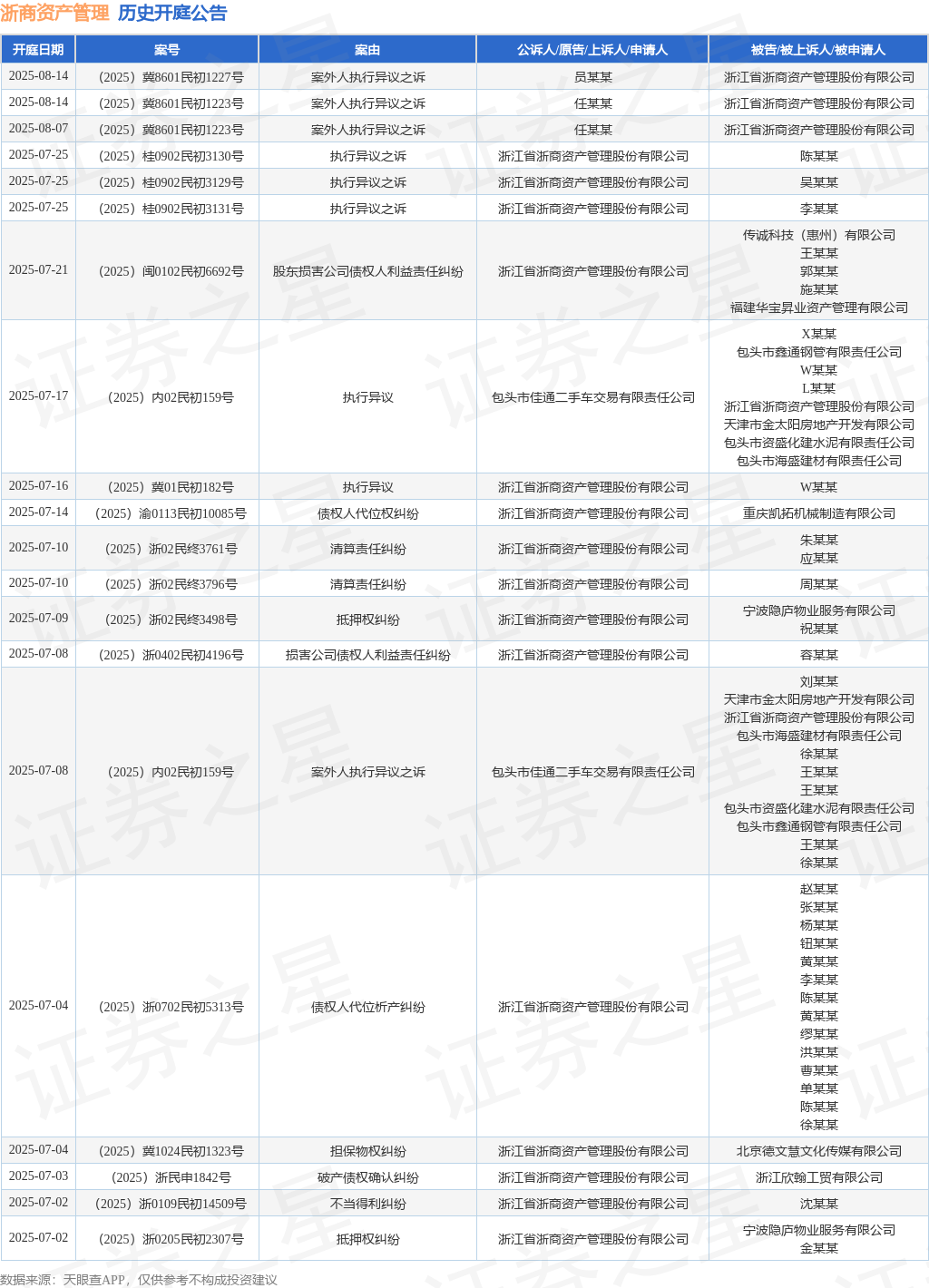 根据统计,近一年内以浙江省浙商资产管理股份有限公司为当事人的历史开庭公告有220则,其中案由为“案外人执行异议之诉”的公告以40则居首,其次为“债权人代位权纠纷”有20则,“执行异议之诉”有20则。历史开庭公告(前20条)如下: