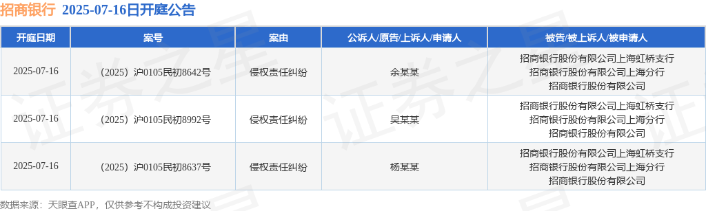 招商银行作为被告/被上诉人的3起涉及侵权责任纠纷的诉讼将于2025年7月16日开庭来源:网络 热度:7℃ 2025/7/14 0:14:25 证券之星消息,根据天眼查APP显示,近日公布了3则招商银行股份有限公司作为被告/被上诉人的开庭公告,案由为侵权责任纠纷,开庭日期为2025年7月16日。详细内容如下: