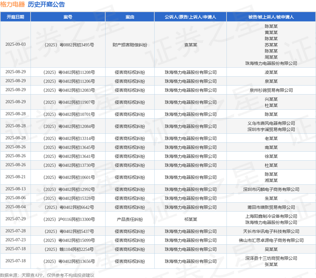 根据统计,近一年内以珠海格力电器股份有限公司为当事人的历史开庭公告有184则,其中案由为“侵害商标权纠纷”的公告以118则居首,其次为“买卖合同纠纷”有21则,“不正当竞争纠纷”有14则。历史开庭公告(前20条)如下: