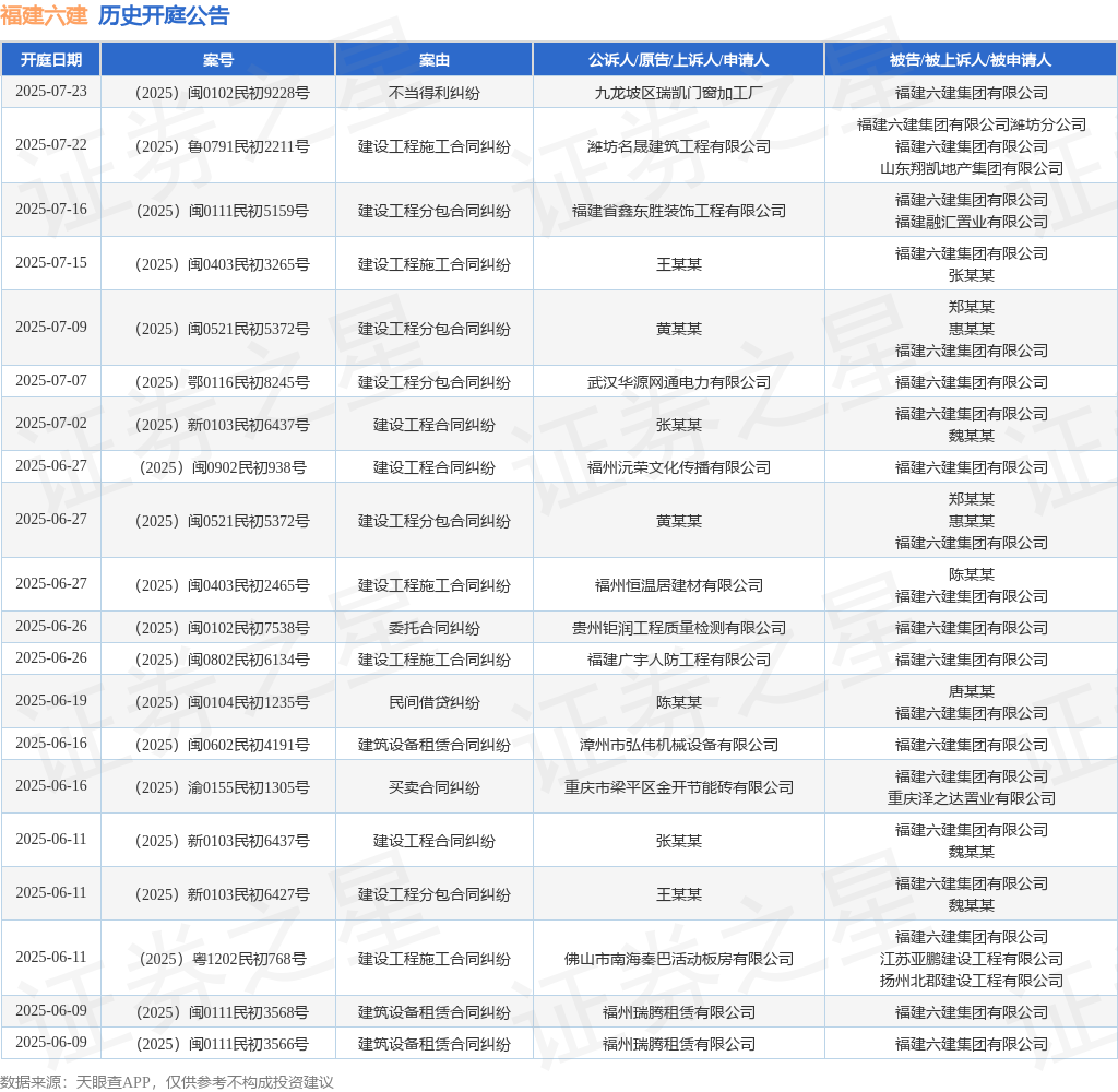 根据统计,近一年内以福建六建集团有限公司为当事人的历史开庭公告有204则,其中案由为“建设工程施工合同纠纷”的公告以51则居首,其次为“劳务合同纠纷”有32则,“买卖合同纠纷”有25则。历史开庭公告(前20条)如下: