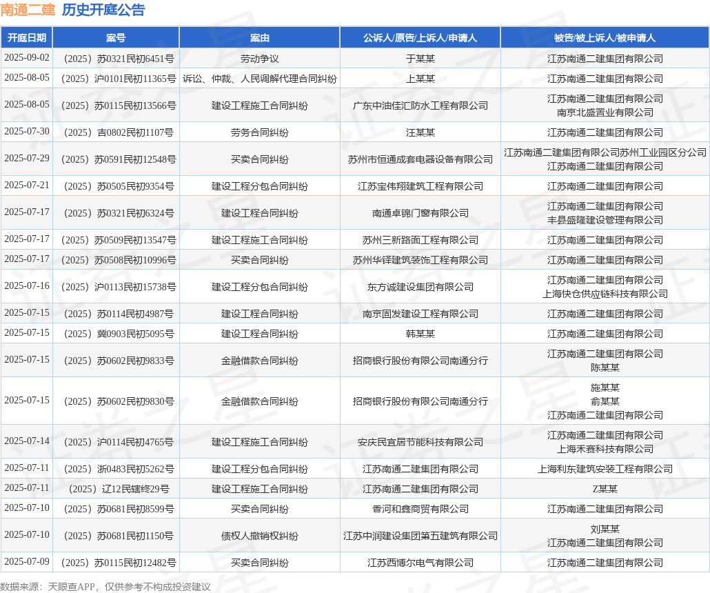 根据统计,近一年内以江苏南通二建集团有限公司为当事人的历史开庭公告有1329则,其中案由为“买卖合同纠纷”的公告以428则居首,其次为“建设工程施工合同纠纷”有217则,“建设工程分包合同纠纷”有146则。历史开庭公告(前20条)如下: