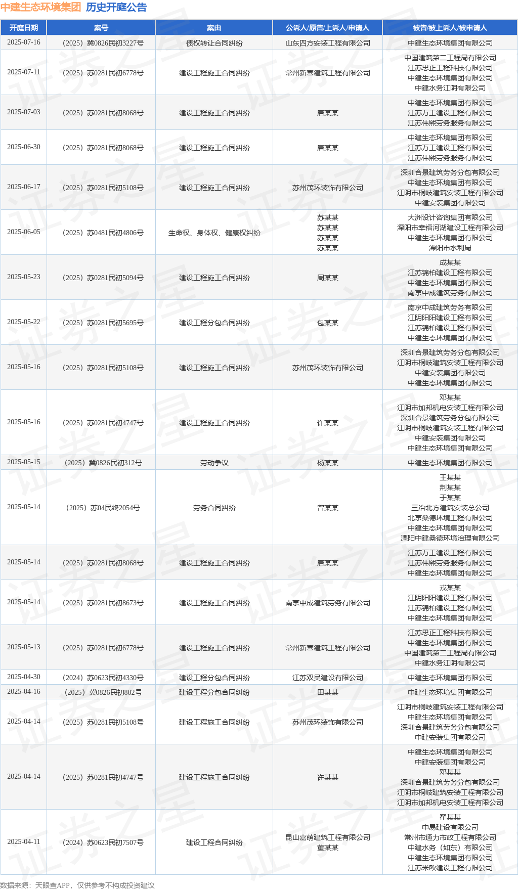 根据统计,近一年内以中建生态环境集团有限公司为当事人的历史开庭公告有46则,其中案由为“建设工程施工合同纠纷”的公告以23则居首,其次为“建设工程合同纠纷”有7则,“建设工程分包合同纠纷”有6则。历史开庭公告(前20条)如下: