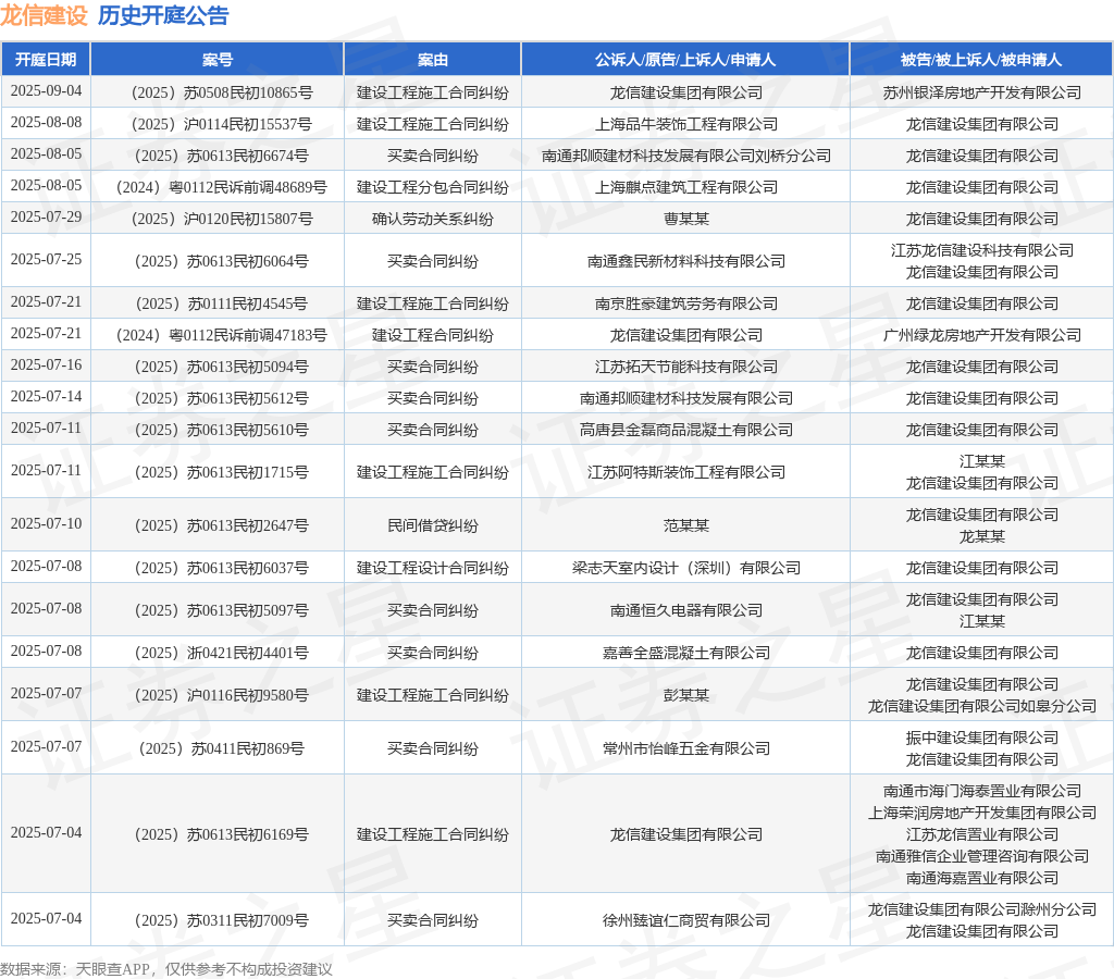根据统计,近一年内以龙信建设集团有限公司为当事人的历史开庭公告有355则,其中案由为“建设工程施工合同纠纷”的公告以81则居首,其次为“买卖合同纠纷”有70则,“建筑设备租赁合同纠纷”有22则。历史开庭公告(前20条)如下:
