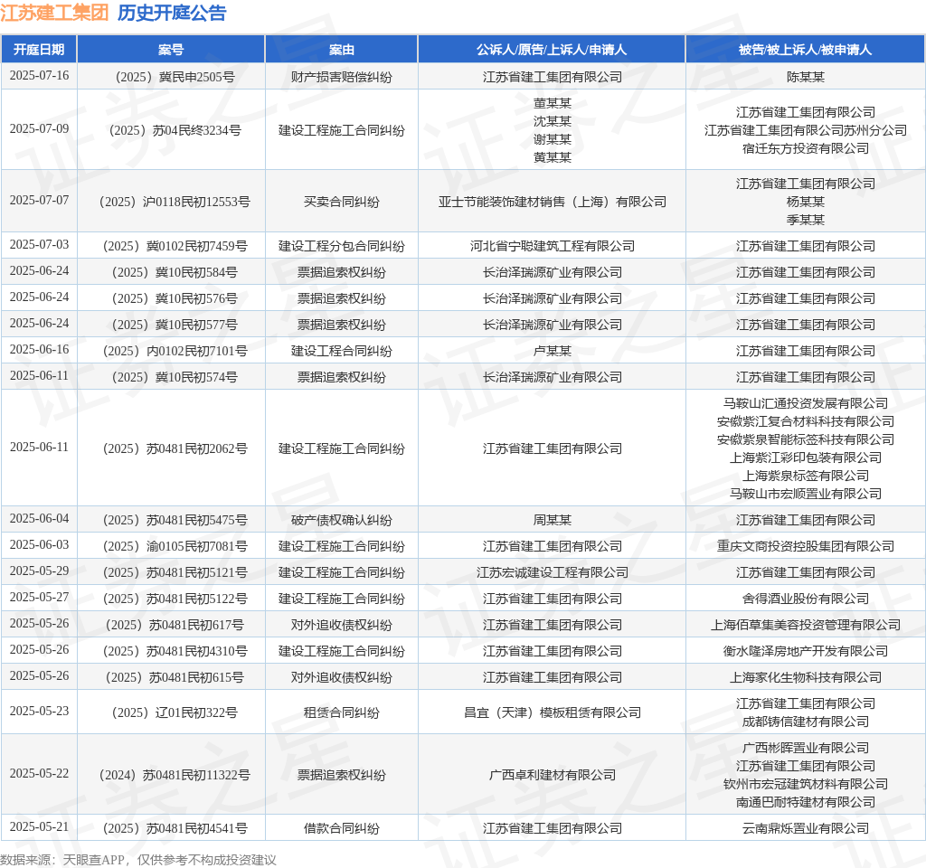 根据统计,近一年内以江苏省建工集团有限公司为当事人的历史开庭公告有195则,其中案由为“建设工程施工合同纠纷”的公告以63则居首,其次为“对外追收债权纠纷”有39则,“票据追索权纠纷”有16则。历史开庭公告(前20条)如下: