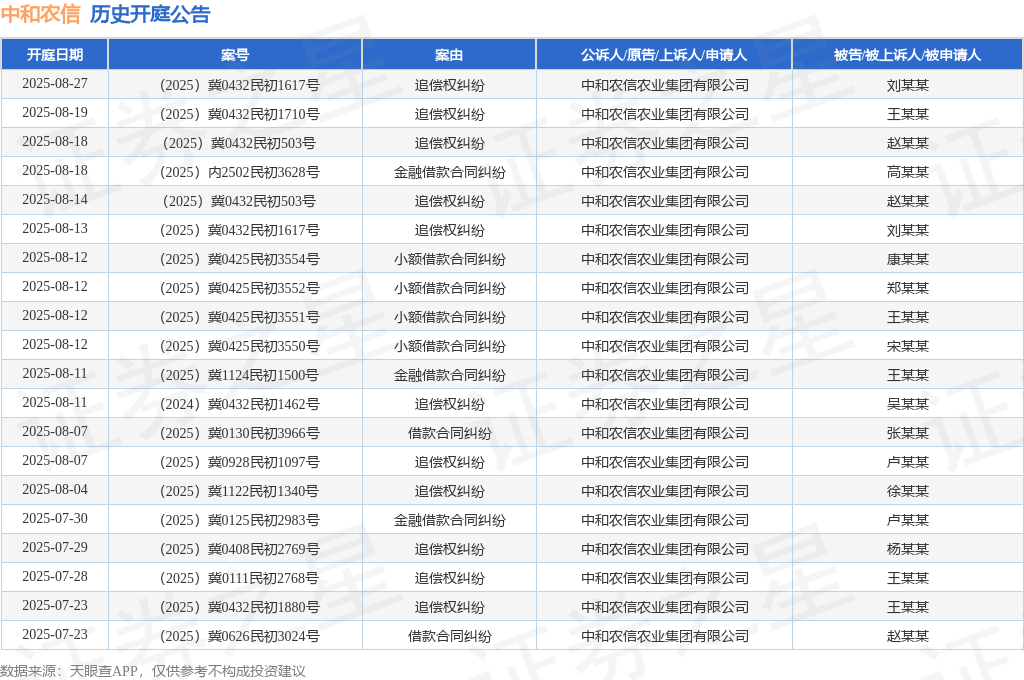 根据统计,近一年内以中和农信农业集团有限公司为当事人的历史开庭公告有470则,其中案由为“借款合同纠纷”的公告以174则居首,其次为“金融借款合同纠纷”有112则,“追偿权纠纷”有83则。历史开庭公告(前20条)如下: