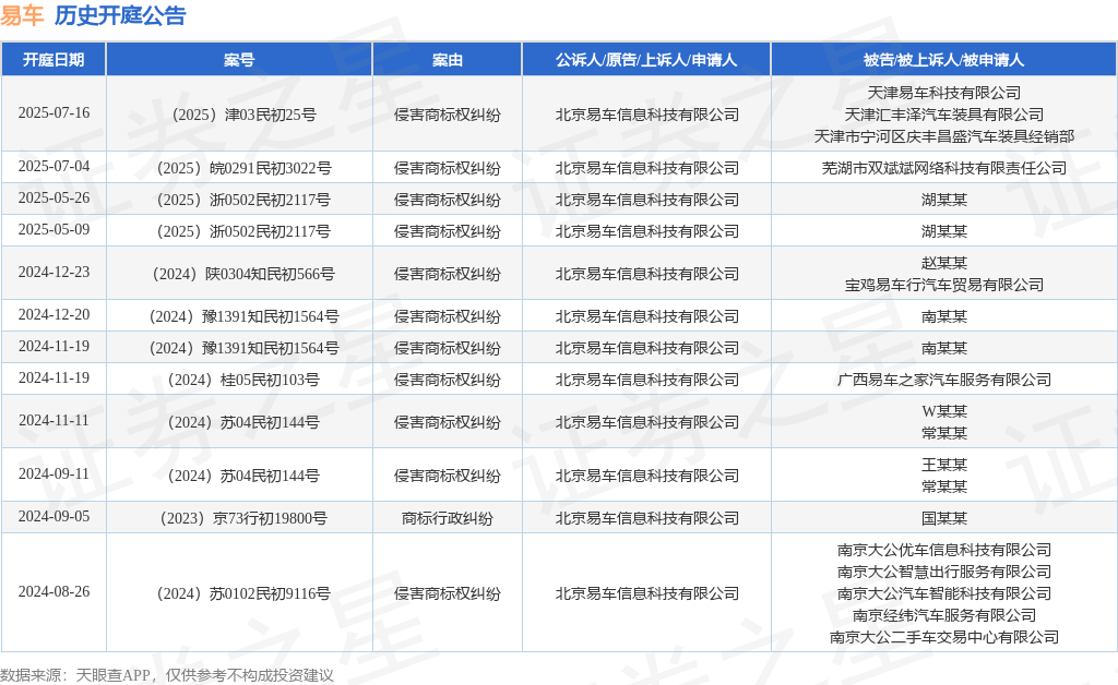 根据统计,近一年内以北京易车信息科技有限公司为当事人的历史开庭公告有12则,其中案由为“侵害商标权纠纷”的公告以11则居首,其次为“商标行政纠纷”有1则。历史开庭公告如下: