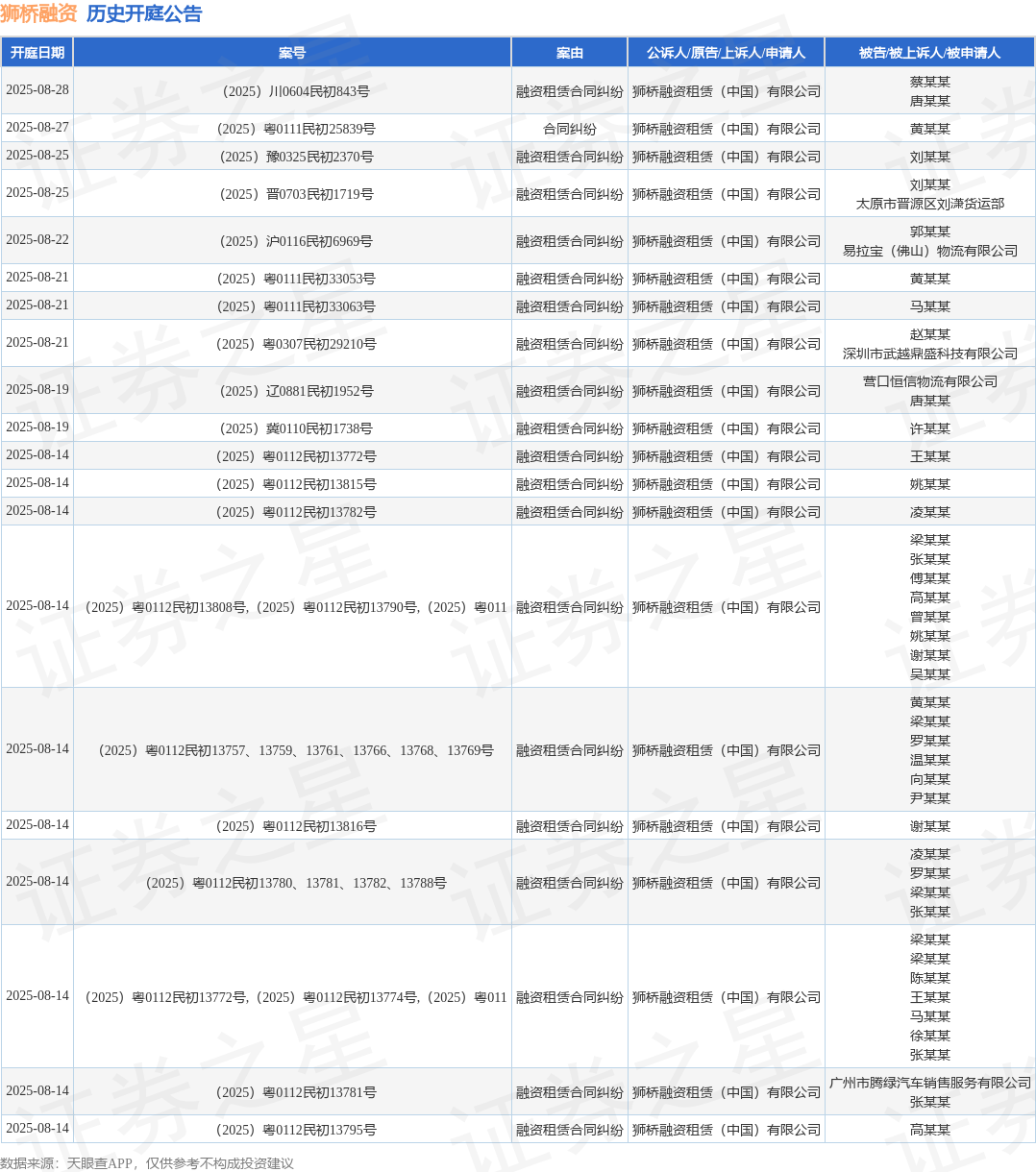 根据统计,近一年内以狮桥融资租赁(中国)有限公司为当事人的历史开庭公告有1422则,其中案由为“融资租赁合同纠纷”的公告以1204则居首,其次为“租赁合同纠纷”有53则,“合同纠纷”有48则。历史开庭公告(前20条)如下: