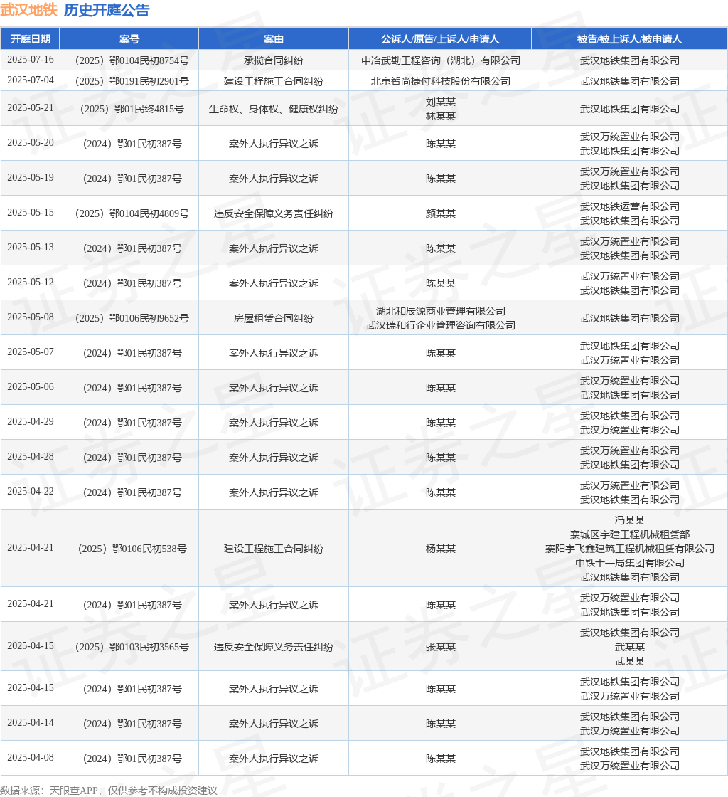 根据统计,近一年内以武汉地铁集团有限公司为当事人的历史开庭公告有153则,其中案由为“案外人执行异议之诉”的公告以119则居首,其次为“违反安全保障义务责任纠纷”有6则,“建设工程施工合同纠纷”有5则。历史开庭公告(前20条)如下: