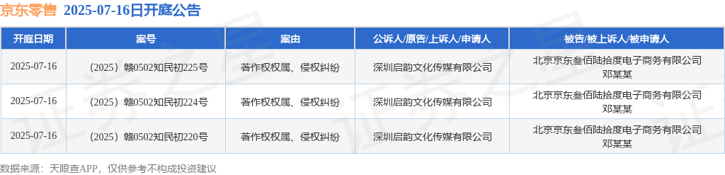 京东零售作为被告/被上诉人的3起涉及著作权权属、侵权纠纷的诉讼将于2025年7月16日开庭来源:网络 热度:25℃ 2025/7/14 0:14:35 证券之星消息,根据天眼查APP显示,近日公布了3则北京京东叁佰陆拾度电子商务有限公司作为被告/被上诉人的开庭公告,案由为著作权权属、侵权纠纷,开庭日期为2025年7月16日。详细内容如下: