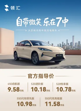新车采用微笑美学前脸设计,拥有越级大空间,兼具长续航、高颜值、智能化等核心优势,为营运、家用两端市场用户,带来高效补能、舒适空间与经济实用的出行新选择,打造闪充车型。领汇e7共推出5款配置,官方指导价9.58-11.58万元。 领汇e7闪充版搭载比亚迪第二代刀片电池及闪充技术,带来“5分钟充好、9分钟充饱、零下30℃只多3分钟”的极速补能体验——电量从10%充到70%,只用5分钟;从10%充到97%,只用9分钟;零下30℃极寒环境下,充电也只比常温多3分钟,彻底解决纯电车型补能慢的行业痛点。正是这种“5分钟充好”的极速体验,让领汇e7成为名副其实的“通勤神器”,无论是早晚高峰的匆忙出发,还是工作间隙的快速补能,它都以分秒必争的效率,完美契合都市通勤族的快节奏生活。 在实现极速闪充的同时,第二代刀片电池更以超越国标的严苛安全验证,打消用户对电池安全的顾虑,成功通过500次闪充循环后的针刺测试,同时触发四节电池短路的热扩散实验,电池均保持完好无损,安全性能远超新国标要求。高安全基础上,能量密度提升5%以上,配合全温域智能热管理系统,有效保障电池循环寿命,实现闪充与长寿命兼得。 领先的闪充技术,离不开广泛布局的补能网络支撑。随着比亚迪闪充中国战略的推进,截至2026年3月5日,已建成闪充站4239座,预计2026年底将建成20000座,让闪充真正遍布全中国。届时,城区5公里、高速公路50公里范围内就有一座闪充站。更值得关注的是,为加速网络覆盖,比亚迪“圆梦建站计划”,只要4位车主在APP上提出建桩意愿,比亚迪就会到现场实地调研,只要具备条件,一周内就能建好闪充站。在使用体验上,比亚迪闪充支持即插即充、无感支付。