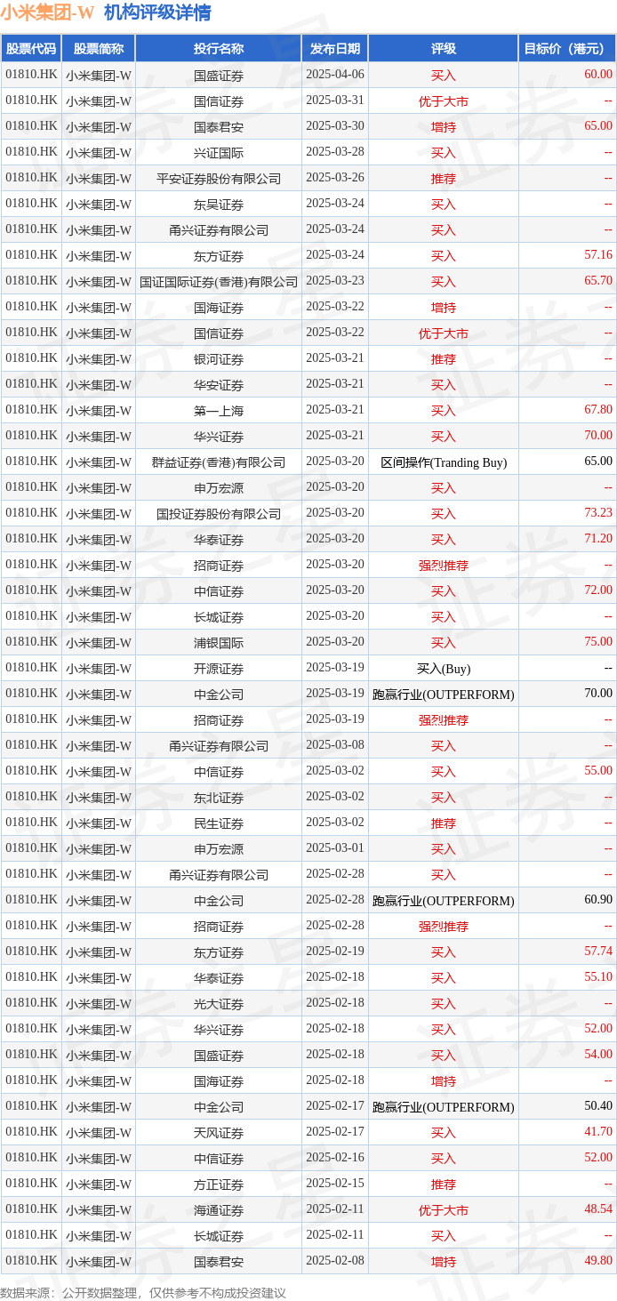 投行对该股的评级以买入为主,近90天内共有28家投行给出买入评级,近90天的目标均价为60.4港元。国盛证券最新一份研报给予小米集团-W买入评级,目标价60港元。