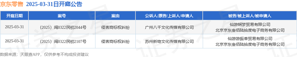 京东零售作为被告/被上诉人的2起涉及侵害商标权纠纷的诉讼将于2025年3月31日开庭来源:网络 热度:23℃ 2025/3/28 21:47:41 证券之星消息,根据天眼查APP显示,近日公布了2则北京京东叁佰陆拾度电子商务有限公司作为被告/被上诉人的开庭公告,案由为侵害商标权纠纷,开庭日期为2025年3月31日。详细内容如下: