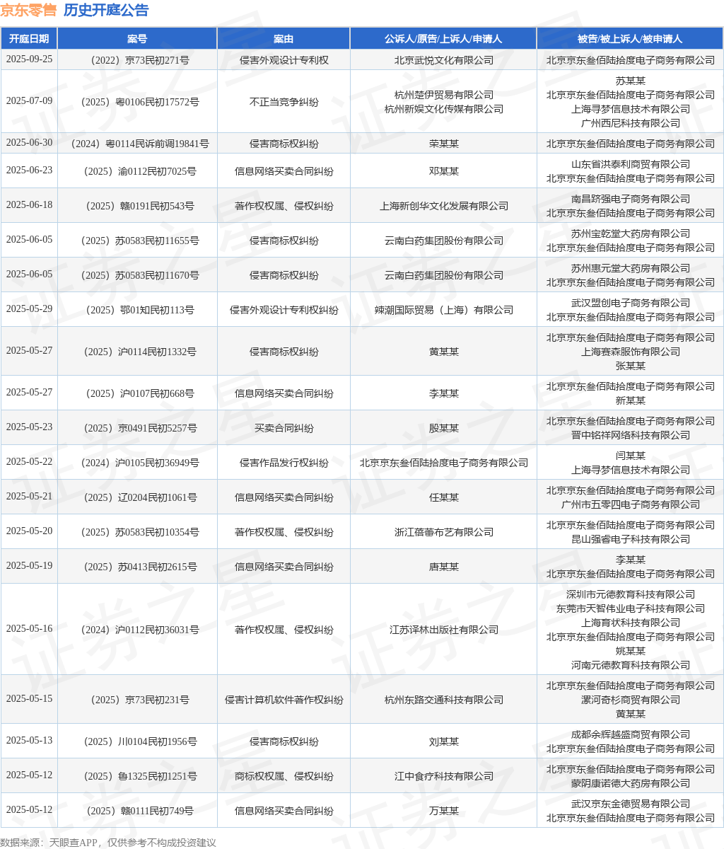 根据统计,近一年内以北京京东叁佰陆拾度电子商务有限公司为当事人的历史开庭公告有1617则,其中案由为“侵害商标权纠纷”的公告以425则居首,其次为“信息网络买卖合同纠纷”有250则,“著作权权属、侵权纠纷”有225则。历史开庭公告(前20条)如下: